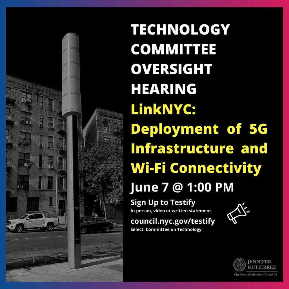 City Council Technology Committee Oversight Hearing on Link5G this Wednesday, June 7, at 1pm.