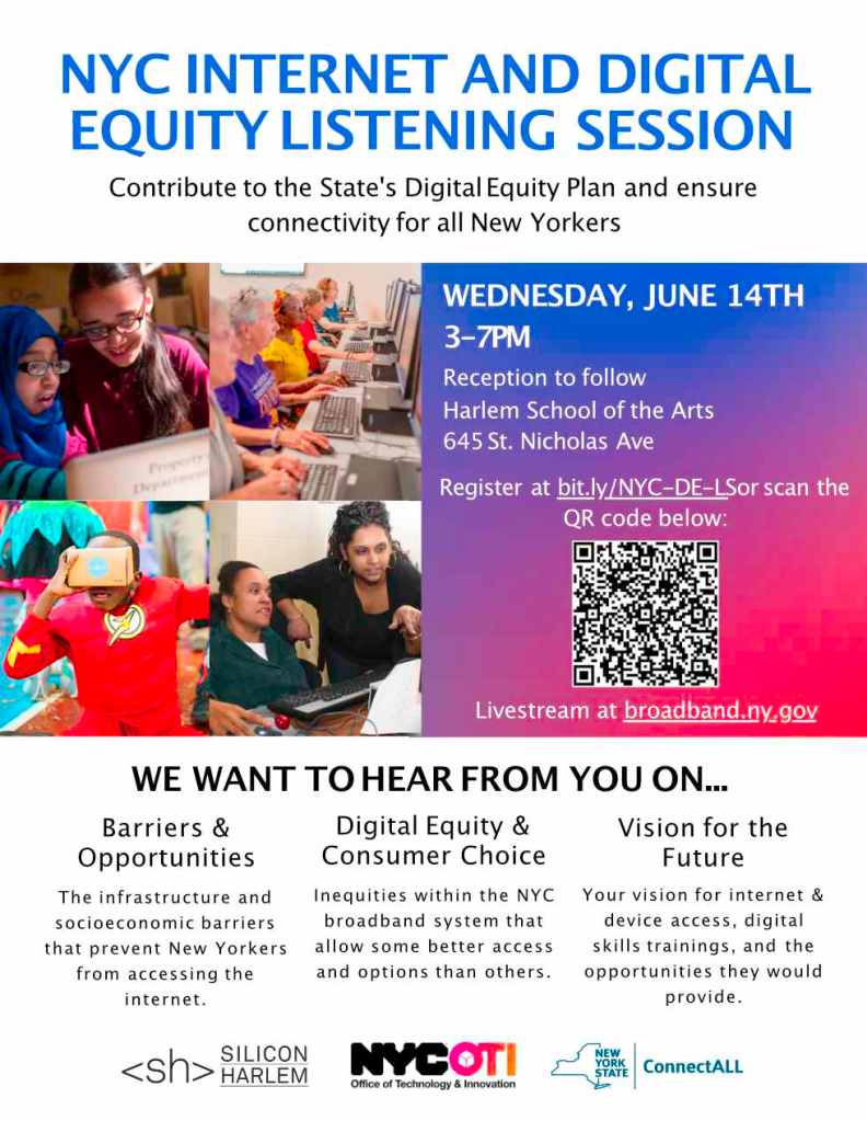 June 14, 3pm, NYC Internet and Digital Equity Listening Session in Harlem. https://www.eventbrite.com/e/new-york-city-internet-and-digital-equity-listening-session-tickets-635503